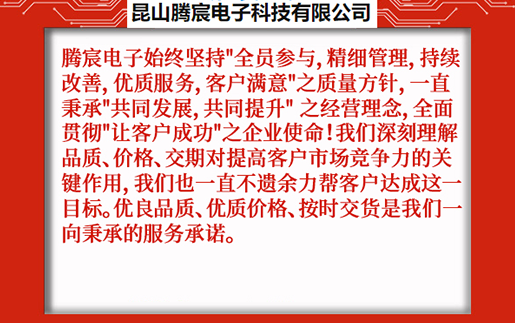 昆山騰宸電子科技有限公司位于中國線路板加工之都昆山千燈,公司專注于電路板研發(fā)設(shè)計(jì)、PCB抄板、元器件采購、SMT貼片加工、組裝測(cè)試,為客戶提供一站式電子制造服務(wù)。騰宸電子始終堅(jiān)持"全員參與,精細(xì)管理,持續(xù)改善,優(yōu)質(zhì)服務(wù),客戶滿意"之質(zhì)量方針,一直秉承"共同發(fā)展,共同提升" 之經(jīng)營理念,全面貫徹"讓客戶成功"之企業(yè)使命!我們深刻理解品質(zhì)、價(jià)格、交期對(duì)提高客戶市場競爭力的關(guān)鍵作用,我們也一直不遺余力幫客戶達(dá)成這一目標(biāo)。優(yōu)良品質(zhì)、優(yōu)質(zhì)價(jià)格、按時(shí)交貨是我們一向秉承的服務(wù)承諾。 ...